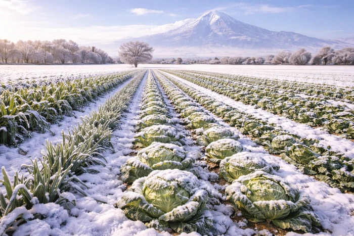 Iğdır Ovası’nda sonbaharda dikimi yapılan kışlık sebzeler, düşük sıcaklıklara karşı dayanıklılığı sayesinde kış boyunca tarlada gelişimini sürdürüyor. Üreticiler, kar altında yapılan hasatla elde edilen ürünleri kent merkezindeki pazarlara taşıyarak satışa sunuyor.
